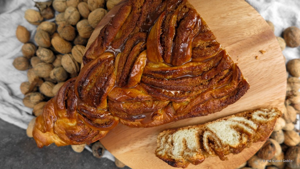 A walnut-filled brioche braided into a thick beard shape, with delicious sticky coffee caramel sauce.